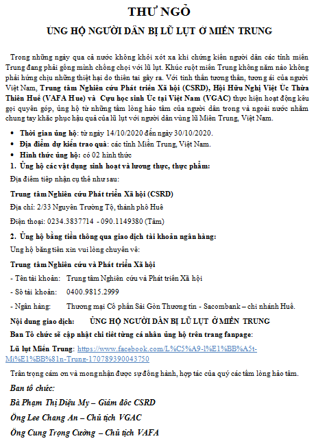 Trong những ngày qua cả nước không khỏi xót xa khi chứng kiến người dân các tỉnh miền Trung đang phải gồng mình chống chọi với lũ lụt. Khúc ruột miền Trung không năm nào không phải hứng chịu những thiệt hại do thiên tai gây ra. Với tinh thần tương thân, tương ái của người Việt Nam, Trung tâm Nghiên cứu Phát triển Xã hội (CSRD), Hội Hữu Nghị Việt Úc Thừa Thiên Huế (VAFA Hue) và Cựu học sinh Úc tại Việt Nam (VGAC) thực hiện hoạt động kêu gọi quyên góp, ủng hộ từ những tấm lòng hảo tâm của người dân trong và ngoài nước nhằm chung tay khắc phục hậu quả của lũ lụt với người dân vùng lũ Miền Trung, Việt Nam.